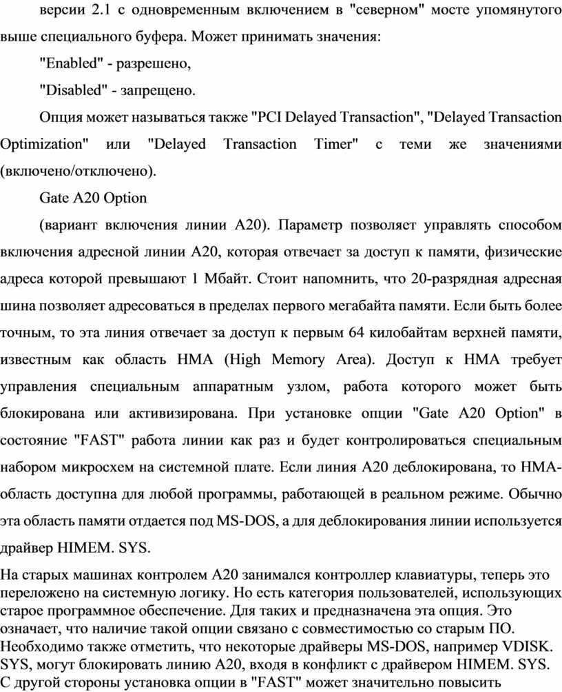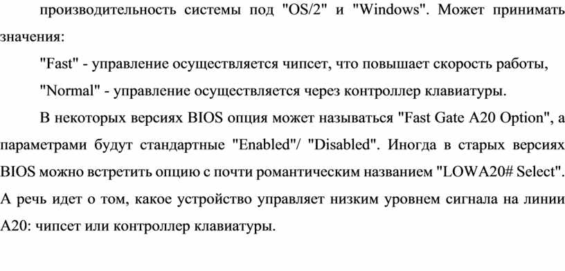 На старых машинах контролем A20 занимался контроллер клавиатуры, теперь это переложено на системную логику. Но есть категория пользователей, использующих старое программное обеспечение. Для таких и предназначена эта опция. Это означает, что наличие такой опции связано с совместимостью со старым ПО. Необходимо также отметить, что некоторые драйверы MS-DOS, например VDISK. SYS, могут блокировать линию А20, входя в конфликт с драйвером HIMEM. SYS. С другой стороны установка опции в "FAST" может значительно повысить производительность системы под "OS/2" и "Windows". Может принимать значения: