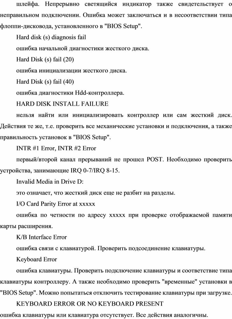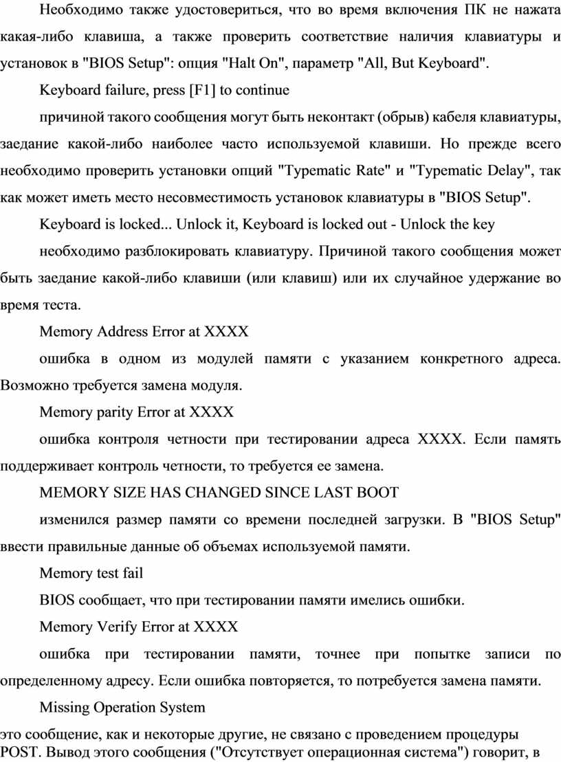 ошибка клавиатуры или клавиатура отсутствует. Все действия аналогичны. Необходимо также удостовериться, что во время включения ПК не нажата какая-либо клавиша, а также проверить соответствие наличия клавиатуры и установок в "BIOS Setup": опция "Halt On", параметр "All, But Keyboard".