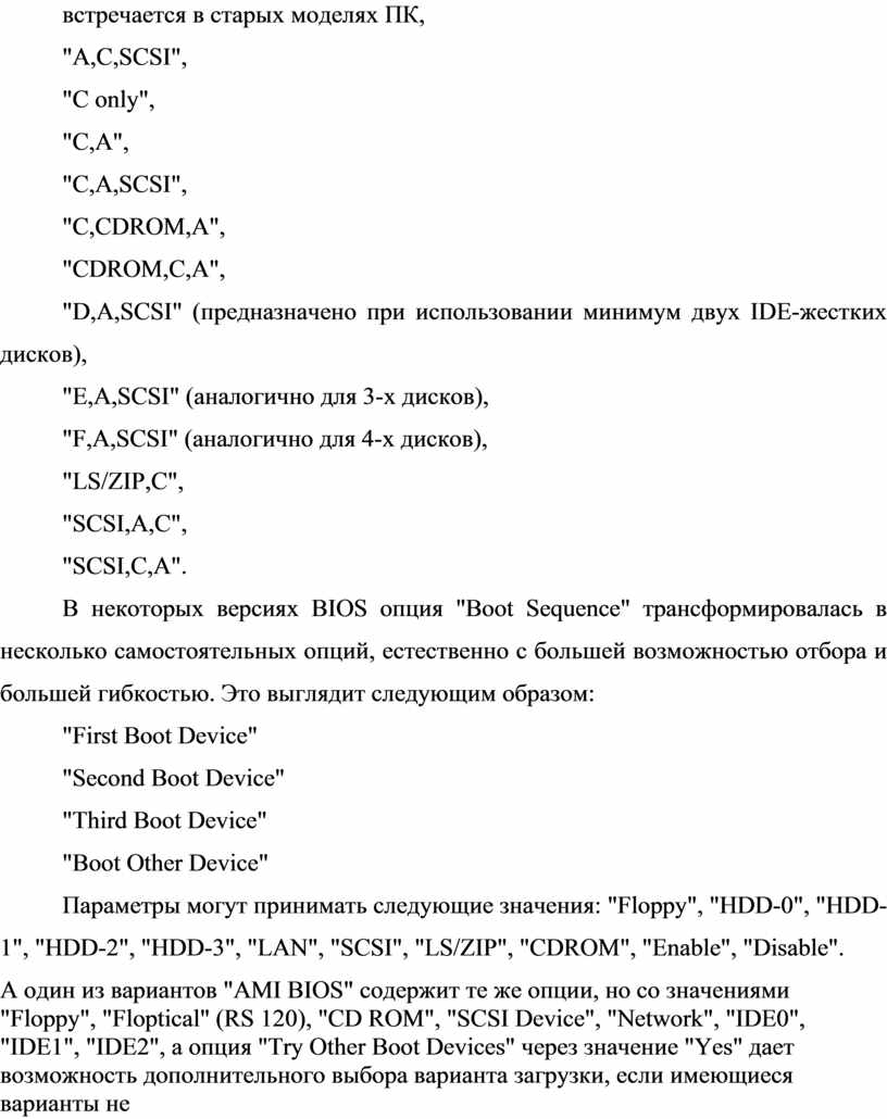 (последовательность начальной загрузки системы). Определяется последовательность опроса накопителей для загрузки операционной системы. Эти устройства обозначаются либо буквами для физических жестких дисков и обычных дисководов, либо названием устройства, например "CDROM" для накопителей CD-ROM. Поддерживаются устройства LS-120, Iomega ZIP, ATAPI CD-ROM, IDE - и SCSI-диски. Может принимать значения: