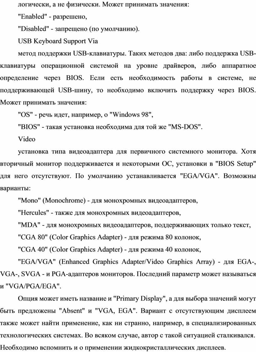 установка типа видеоадаптера для первичного системного монитора. Хотя вторичный монитор поддерживается и некоторыми ОС, установки в "BIOS Setup" для него отсутствуют. По умолчанию устанавливается "EGA/VGA". Возможны варианты: