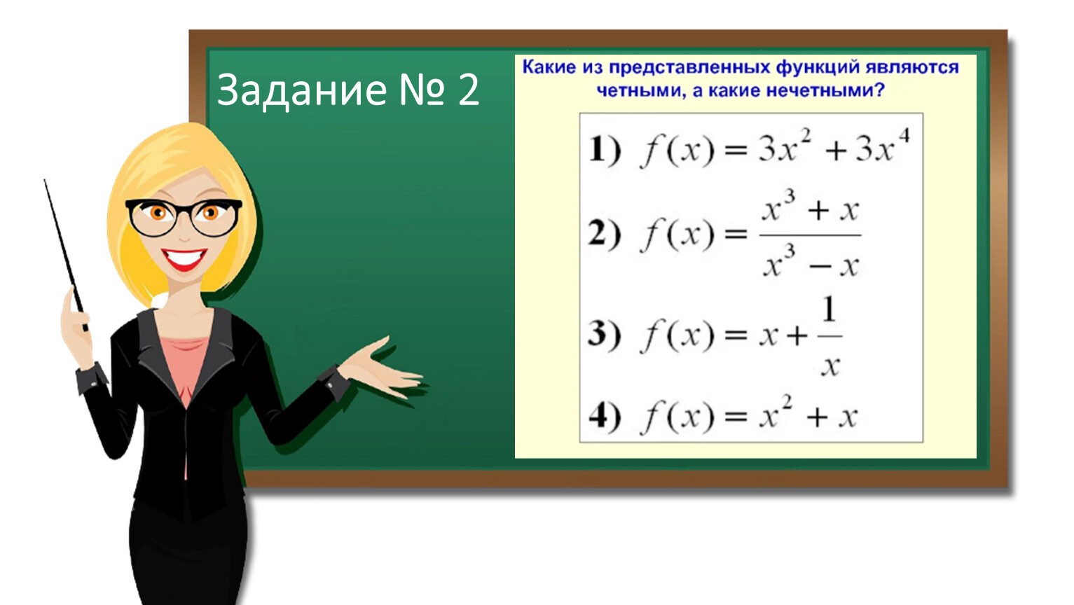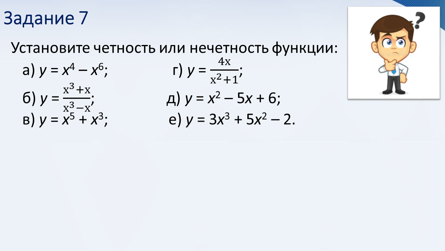 Установите четность или нечетность функции: а) у = х4 – х6; г) у = 4х х 2 +1 4х 4х х 2 +1 х 2 х х 2 2 х 2 +1 4х х 2 +1 ; б) у = х 3 +х х 3 −х х 3 х х 3 3 х 3 +х х 3 +х х 3 −х х 3 х х 3 3 х 3 −х х 3 +х х 3 −х ; д) у = х2 – 5х + 6; в) у = х5 + х3; е) у = 3х3 + 5х2 – 2.