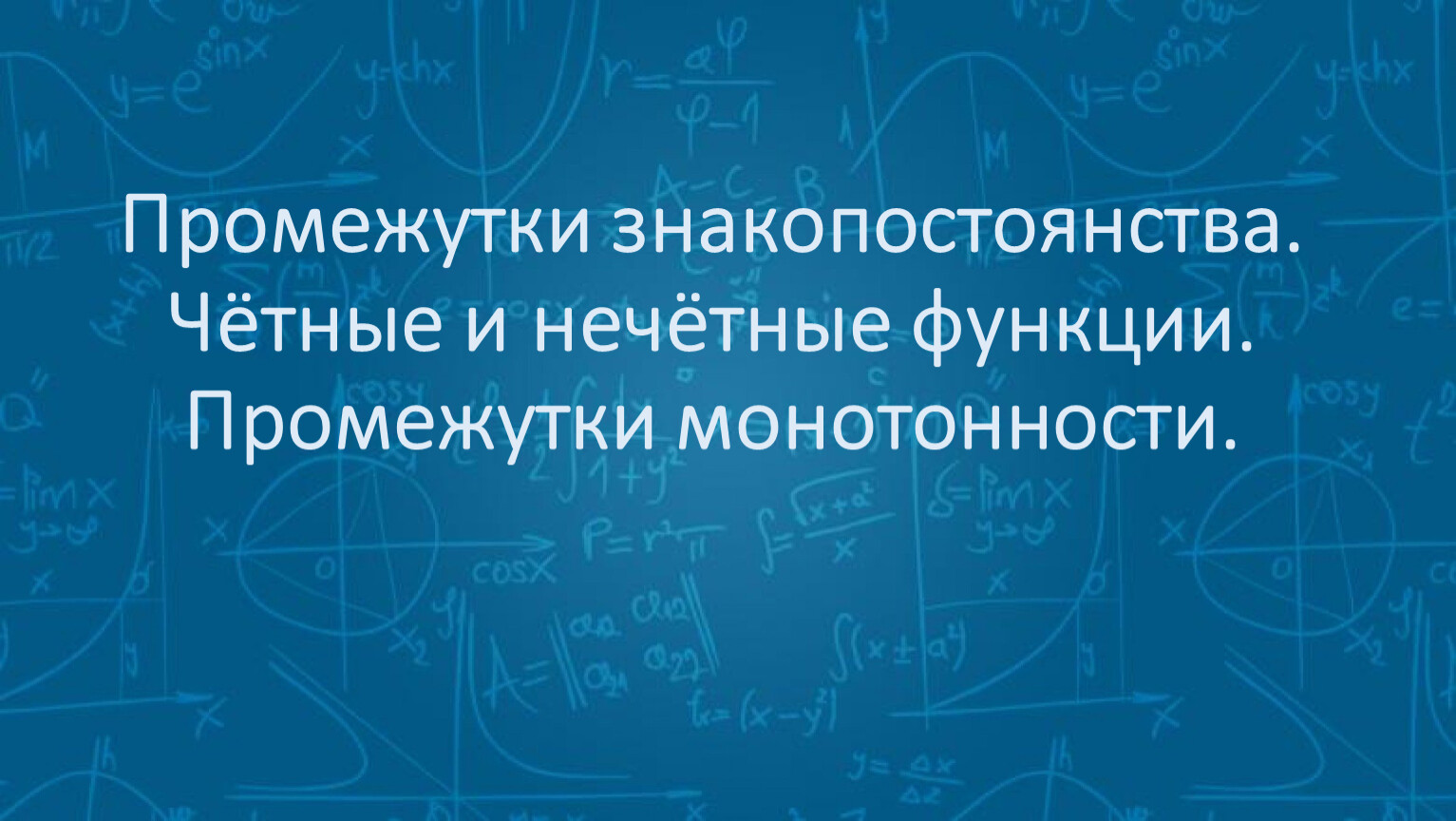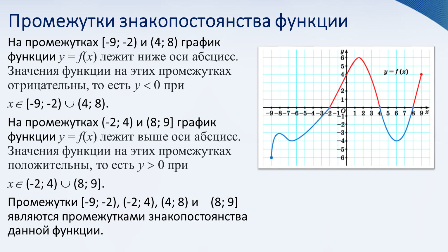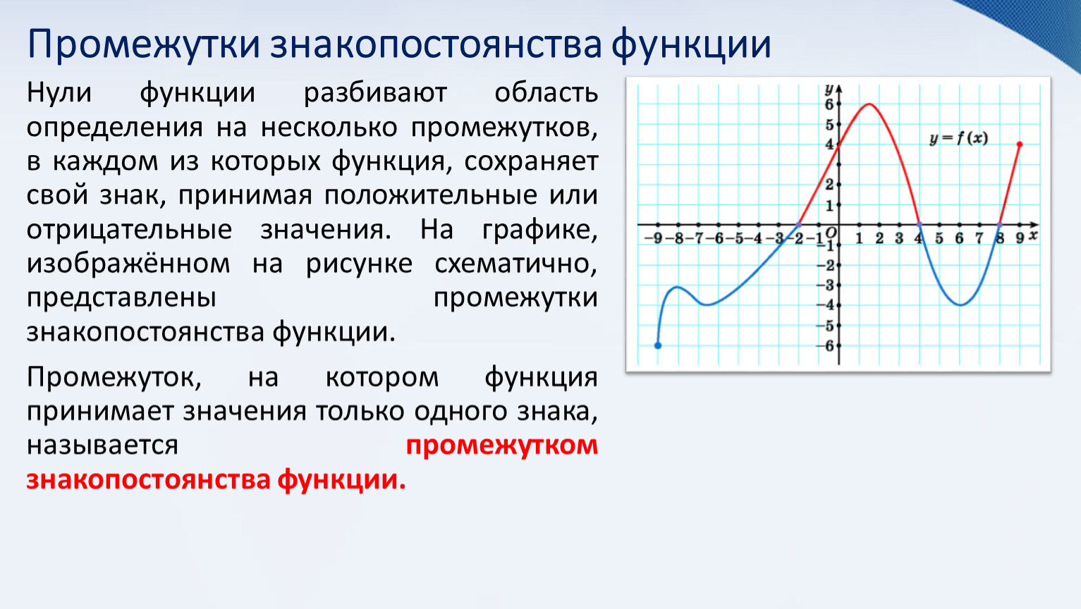 Промежуток, на котором функция принимает значения только одного знака, называется промежутком знакопостоянства функции.