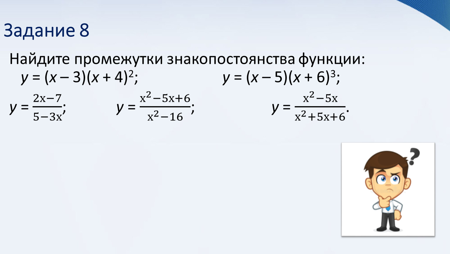 Найдите промежутки знакопостоянства функции: у = (х – 3)(х + 4)2; у = (х – 5)(х + 6)3;