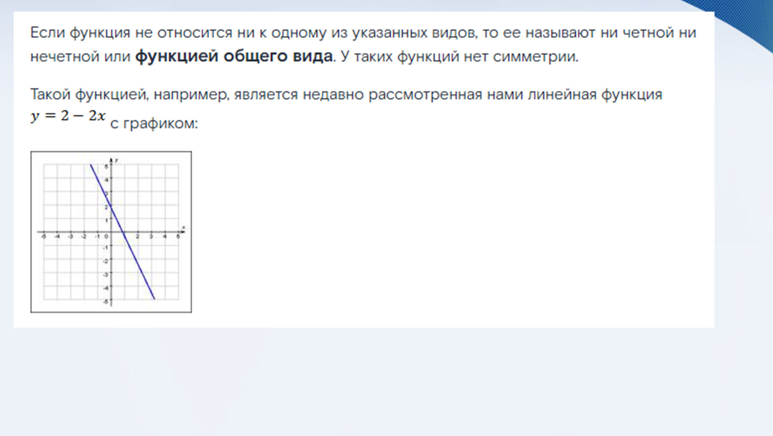 Данная функция не является ни четной, ни нечетной. Она является функцией общего вида.