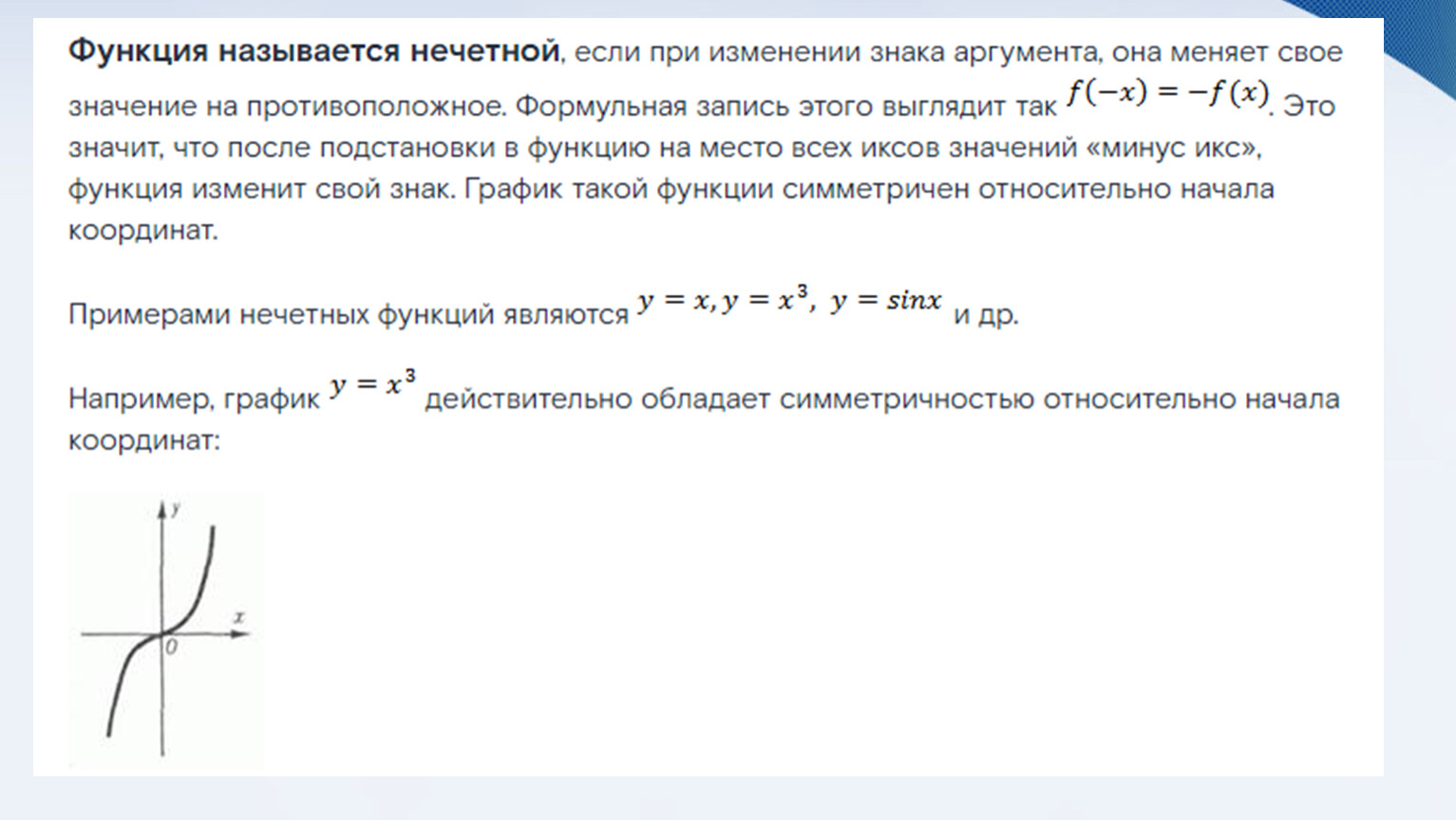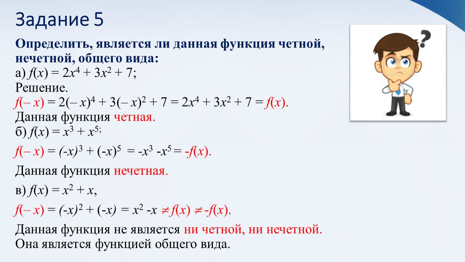 Определить, является ли данная функция четной, нечетной, общего вида: а) f(х) = 2х4 + 3х2 + 7; Решение. f(– х) = 2(– х)4 + 3(– х)2 + 7 = 2х4 + 3х2 + 7 = f(х). Данная функция четная. б) f(х) = x3 + x5;