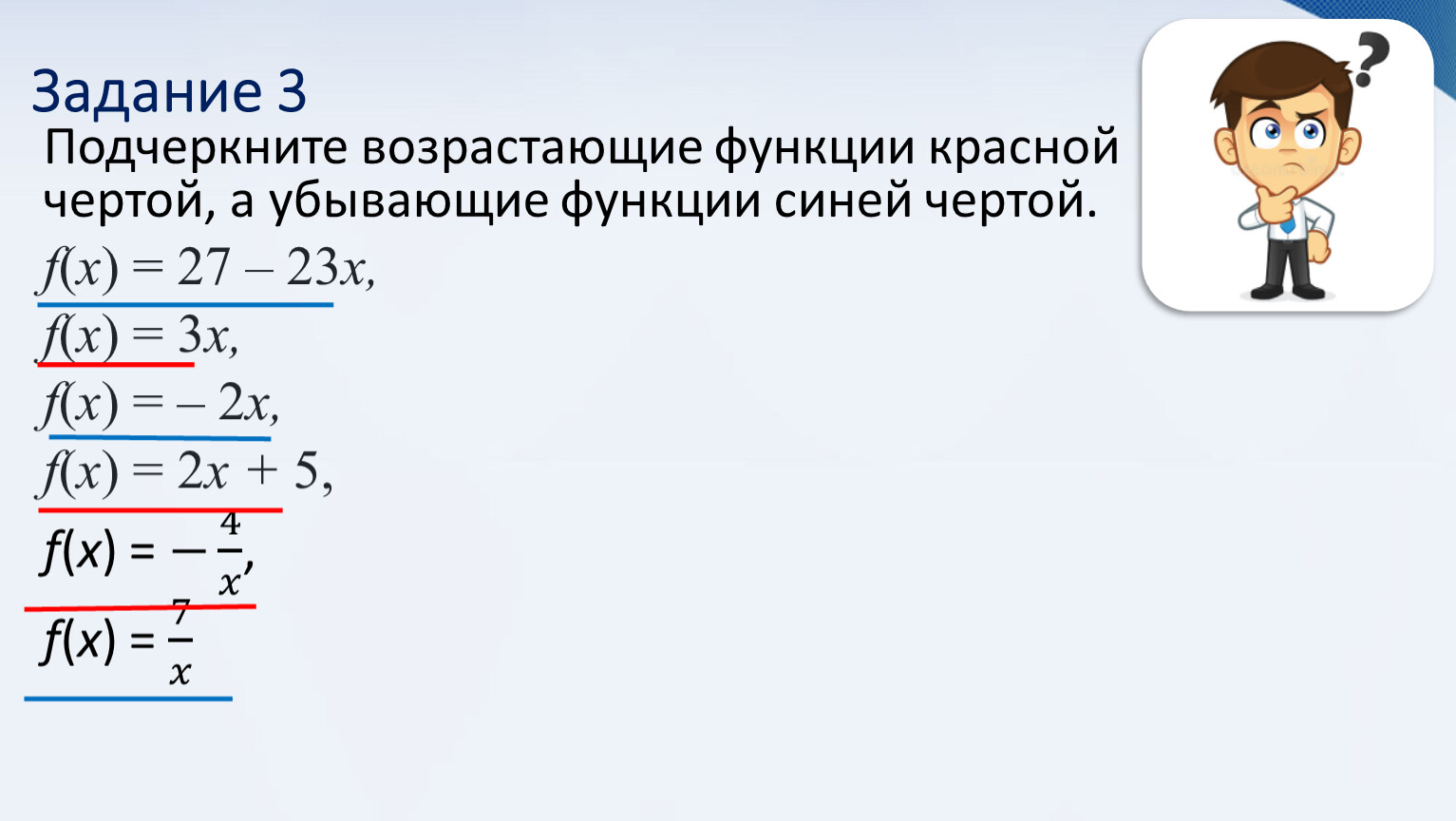 Подчеркните возрастающие функции красной чертой, а убывающие функции синей чертой.