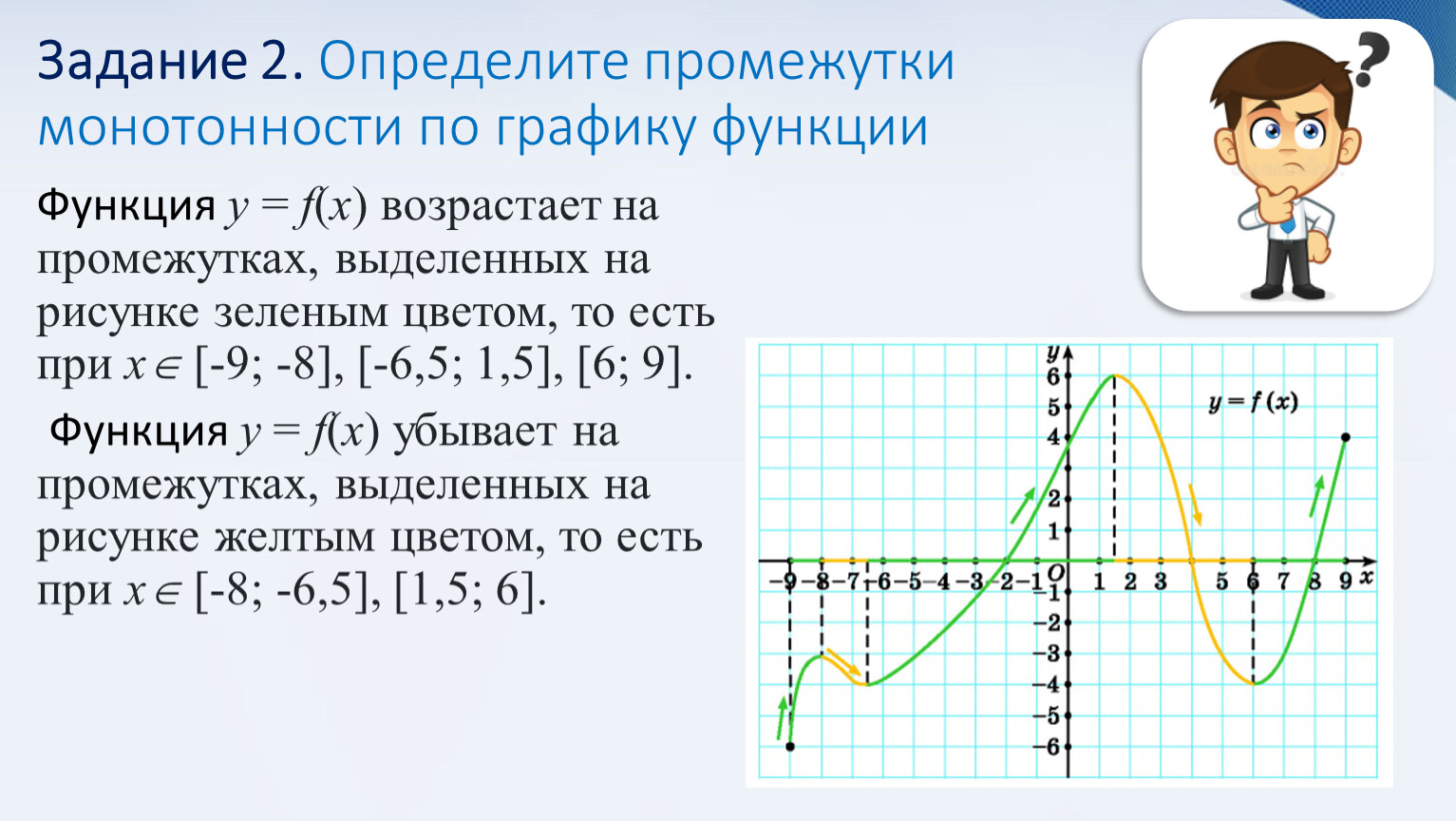 Функция y = f(x) возрастает на промежутках, выделенных на рисунке зеленым цветом, то есть при x [-9; -8], [-6,5; 1,5], [6; 9].