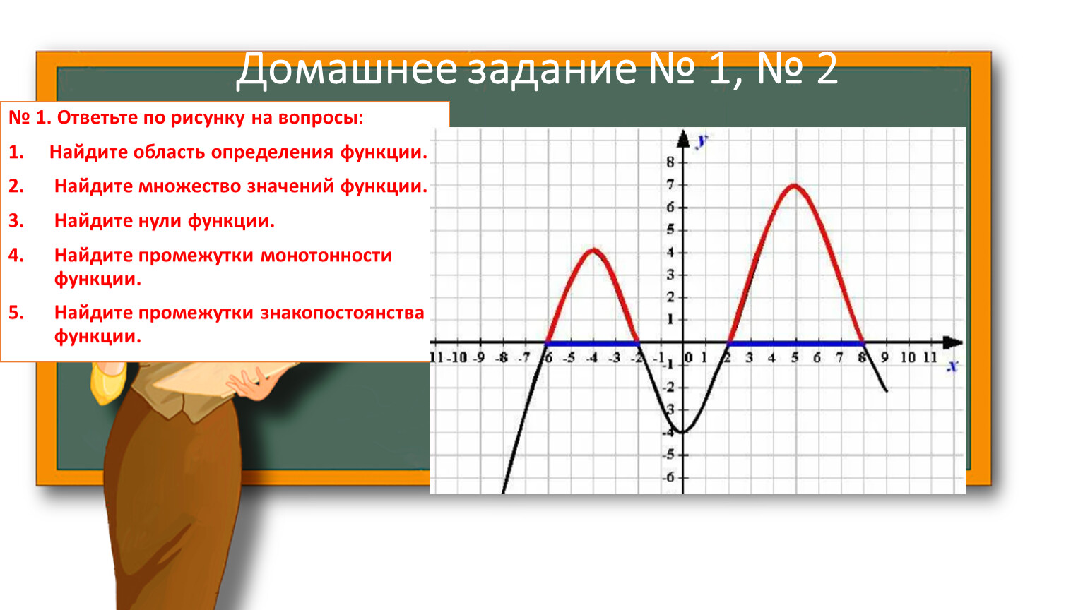 Нули функции разбивают область определения на несколько промежутков, в каждом из которых функция, сохраняет свой знак, принимая положительные или отрицательные значения. На графике, изображённом на рисунке схематично, представлены промежутки знакопостоянства функции.