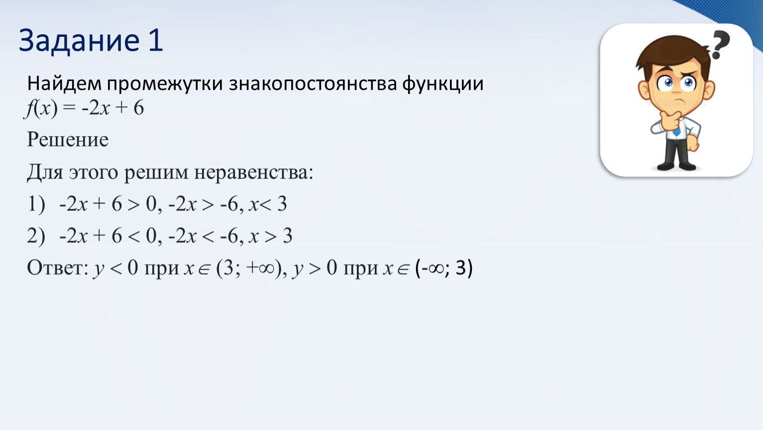 Найдем промежутки знакопостоянства функции f(x) = -2х + 6