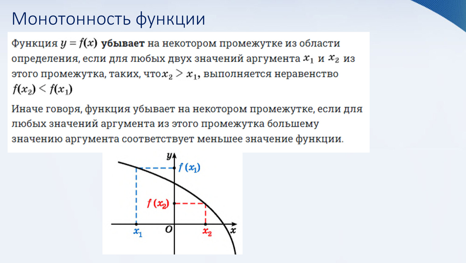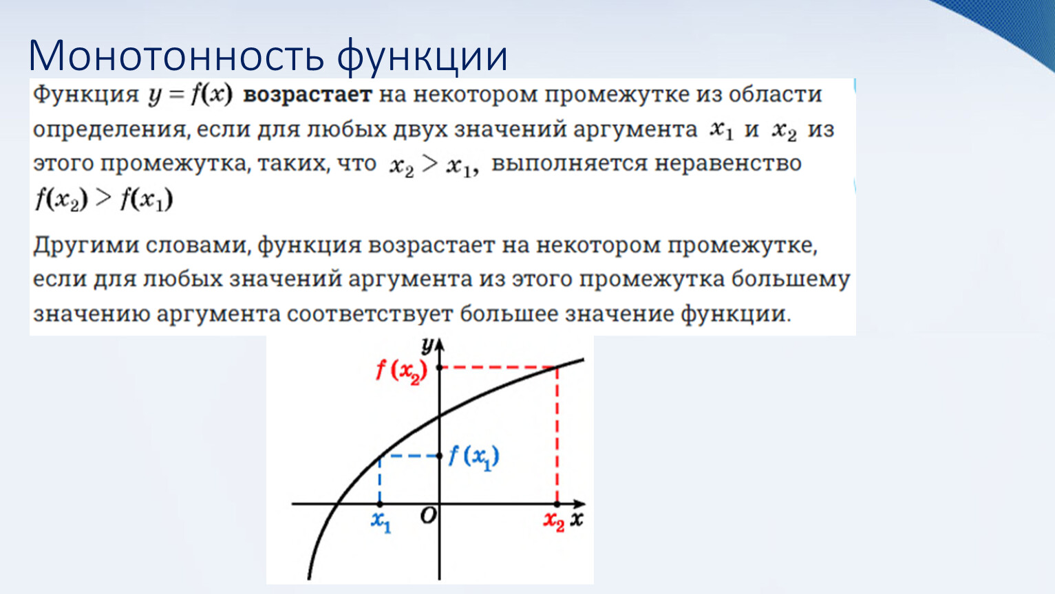 Промежутки возрастания и убывания функции называют промежутками монотонности функции, а функцию называют монотонной на промежутке возрастания или убывания.