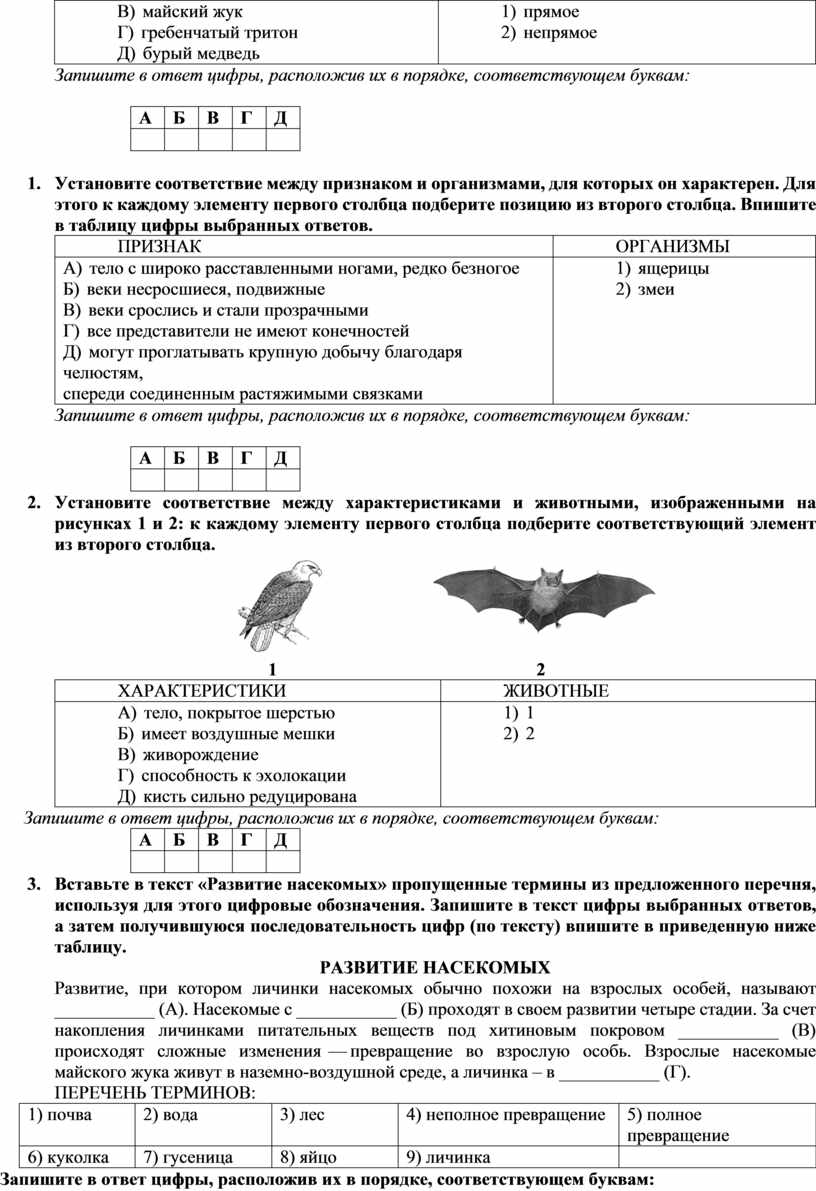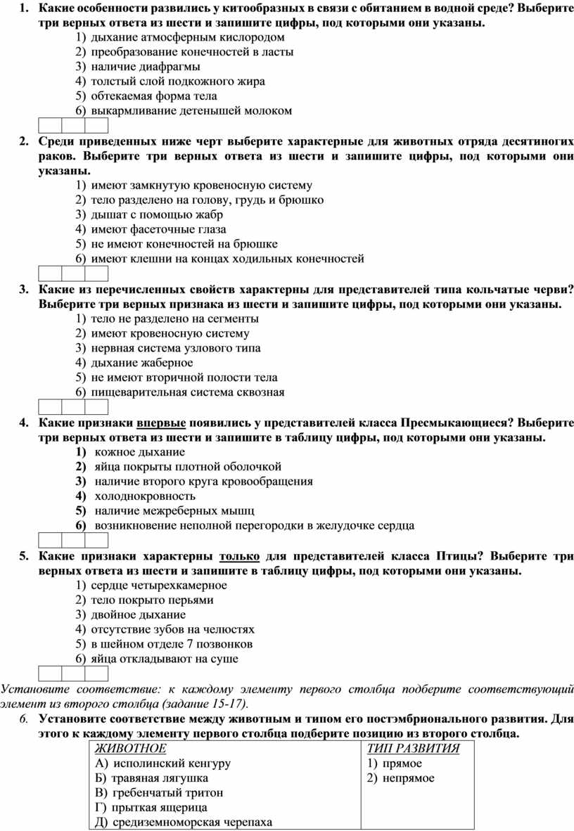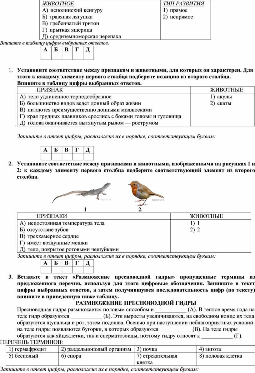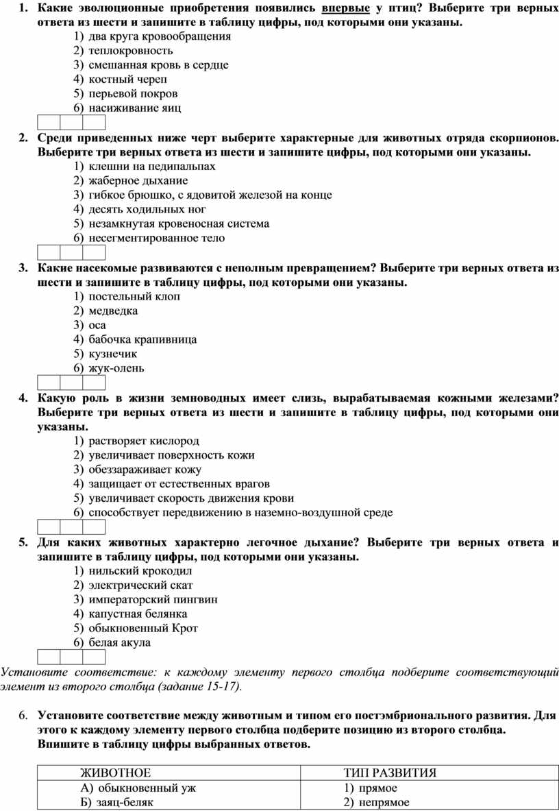 15. Установите соответствие между животным и типом его постэмбрионального развития. Для этого к каждому элементу первого столбца подберите позицию из второго столбца. Впишите в таблицу цифры выбранных ответов.
