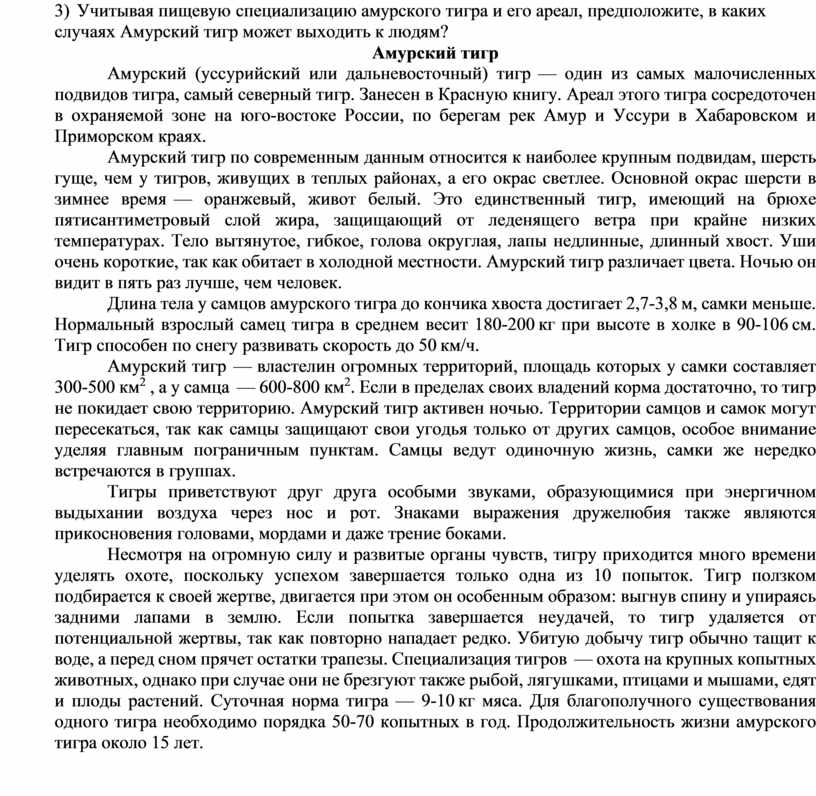 19. Пояснение. 1. Ареал Амурского тигра сосредоточен в охраняемой зоне на юго-востоке России, по берегам рек Амур и Уссури в Хабаровском и Приморском краях. 2. Амурский тигр наиболее активен в ночное время суток. 3. Поскольку Амурский тигр обычно не покидает пределов своей территории, его выход к человеческому жилью происходит редко. Однако поскольку пищевая специализация тигра - крупные копытные животные, он может выходить к людским поселениям тогда, когда на его территории не на кого охотиться. |