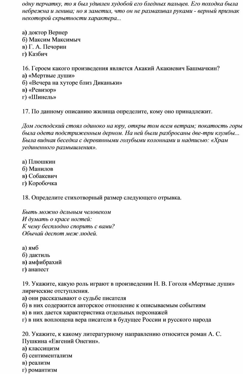20. Укажите, к какому литературному направлению относится роман А. С. Пушкина «Евгений Онегин».