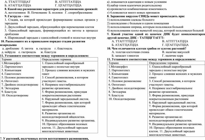 1.Установите соответствие между способами размножения и их биологическими особенностями
