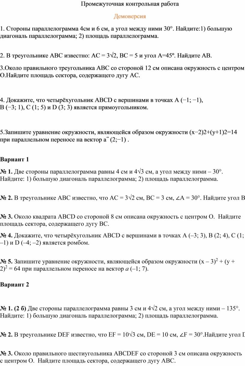 диагональ параллелограмма; 2) площадь параллелограмма.