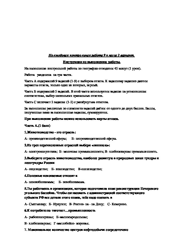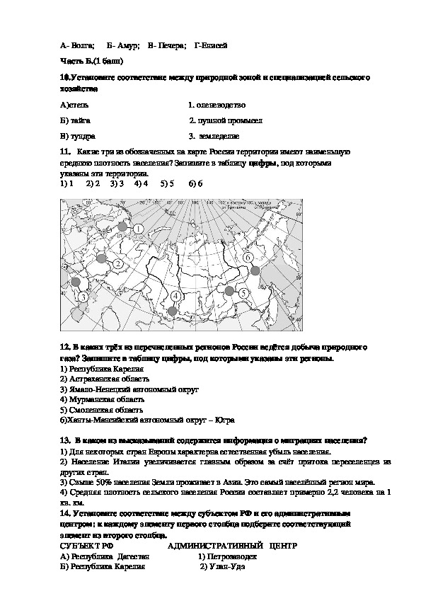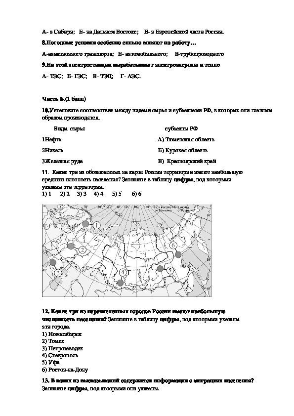 7. Максимальное количество центров нефтедобычи сосредоточеноА в Сибири; Б на Дальнем Востоке; В в Европейской части России.