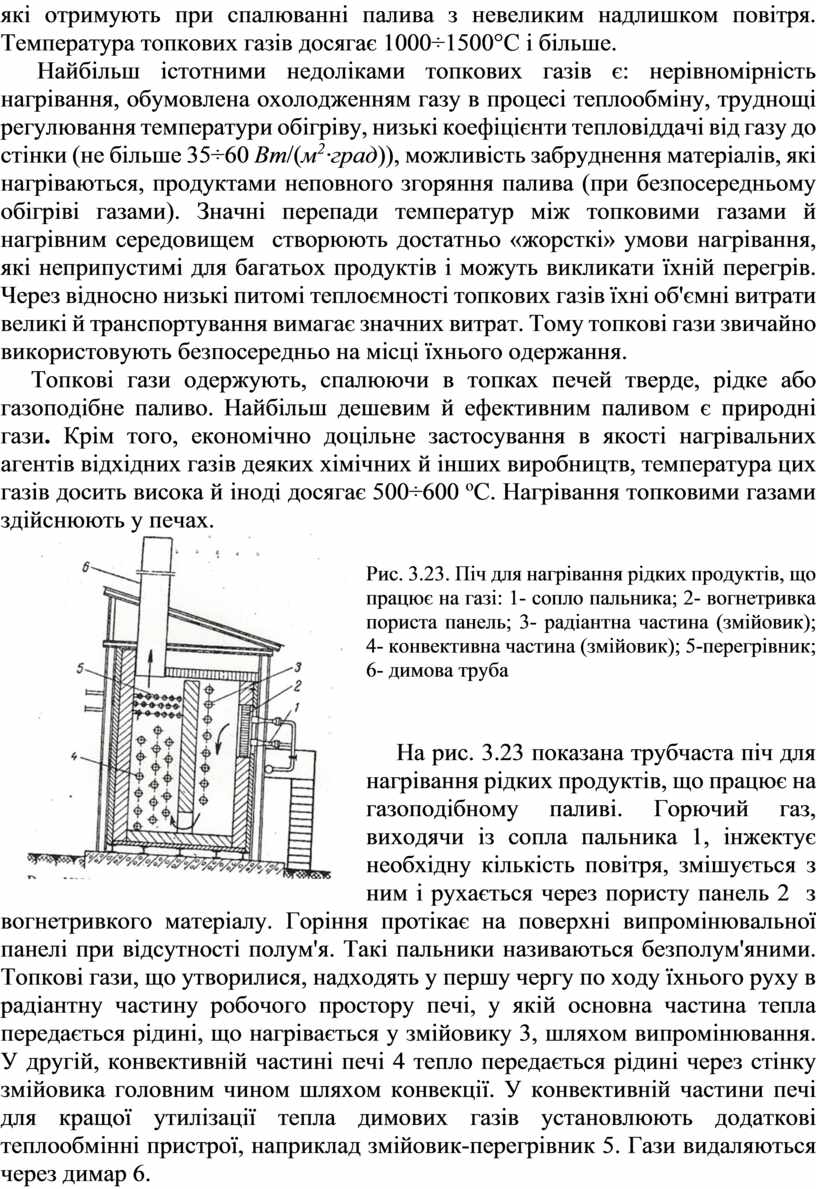 На рис. 3.23 показана трубчаста піч для нагрівання рідких продуктів, що працює на газоподібному паливі. Горючий газ, виходячи із сопла пальника 1, інжектує необхідну кількість повітря, змішується з ним і рухається через пористу панель 2 з вогнетривкого матеріалу. Горіння протікає на поверхні випромінювальної панелі при відсутності полум'я. Такі пальники називаються безполум'яними. Топкові гази, що утворилися, надходять у першу чергу по ходу їхнього руху в радіантну частину робочого простору печі, у якій основна частина тепла передається рідині, що нагрівається у змійовику 3, шляхом випромінювання. У другій, конвективній частині печі 4 тепло передається рідині через стінку змійовика головним чином шляхом конвекції. У конвективній частини печі для кращої утилізації тепла димових газів установлюють додаткові теплообмінні пристрої, наприклад змійовик-перегрівник 5. Гази видаляються через димар 6.