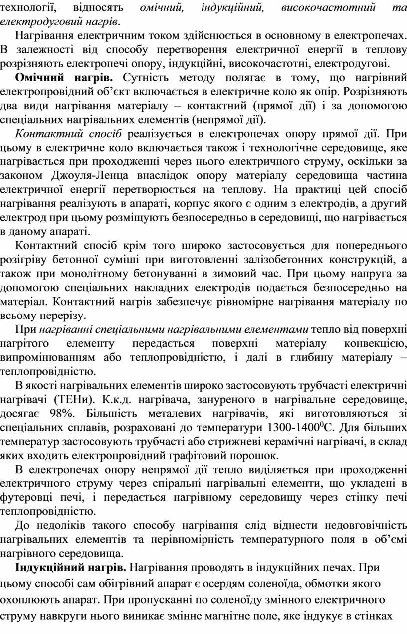 Індукційний нагрів. Нагрівання проводять в індукційних печах. При цьому способі сам обігрівний апарат є осердям соленоїда, обмотки якого охоплюють апарат. При пропусканні по соленоїду змінного електричного струму навкруги нього виникає змінне магнітне поле, яке індукує в стінках обігрівного апарату електрорушійну силу і викликає появу вихрових токів Фуко, під дією яких і проходить розігрів всієї маси апарату. Індукційне нагрівання забезпечує більш рівномірний обігрів при температурах до 4000С.До недоліків методу відносять громіздкість індукційних котушок, неможливість забезпечити однорідне температурне поле, а також низький к.к.д. обладнання.