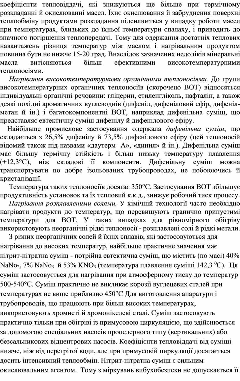 Нагрівання високотемпературними органічними теплоносіями. До групи високотемпературних органічних теплоносіїв (скорочено ВОТ) відносяться індивідуальні органічні речовини: гліцерин, етиленгліколь, нафталін, а також деякі похідні ароматичних вуглеводнів (дифеніл, дифеніловий ефір, дифеніл-метан й ін.) і багатокомпонентні ВОТ, наприклад дифенільна суміш, що представляє евтектичну суміш дифенілу й дифенілового ефіру.
