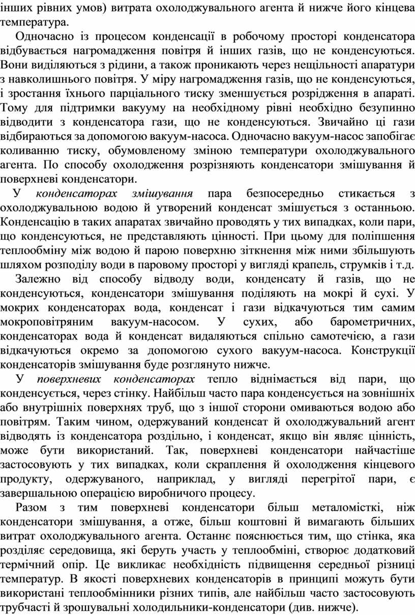 Конденсацію пари часто використовують в основних хіміко-технологічних процесах, наприклад при випарюванні, вакуум-сушінні та ін., для створення розрідження. Пари, що підлягають конденсації, звичайно відводять із апарата, де вони утворюються, в окремий закритий апарат, що служить для конденсації парів, - конденсатор, охолоджуваний водою або повітрям. Об’єм одержуваного конденсату в тисячу й більше разів менше об’єму пари, з якого він утворився. У результаті в конденсаторі утворюється розріджений простір, причому розрідження збільшується зі зменшенням температури конденсації. Остання, у свою чергу, тим нижче, чим більше (за інших рівних умов) витрата охолоджувального агента й нижче його кінцева температура.