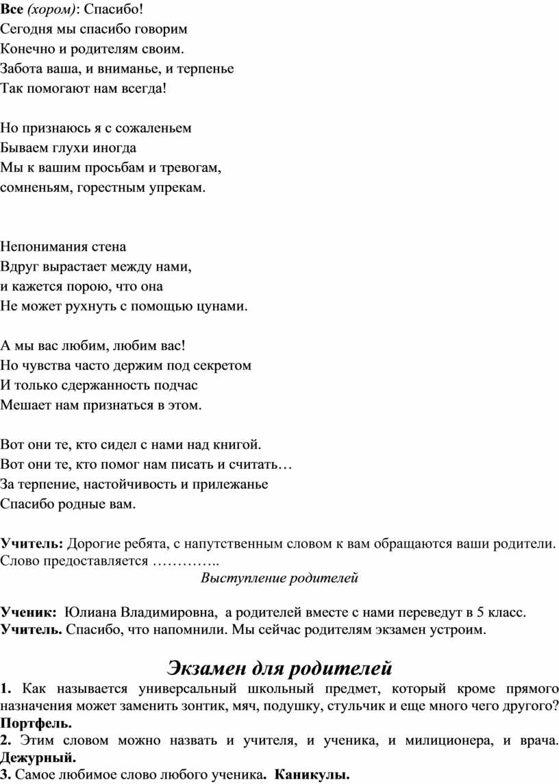 Учитель: Все эти годы и дни из урока в урок, из четверти в четверть вместе с вами учились заново и ваши родители. Они тоже, а может быть, и больше вас волновались, переживали неудачи, радовались победам... Вместе с вами они сейчас здесь на празднике, и всем им мы говорим огромное...
