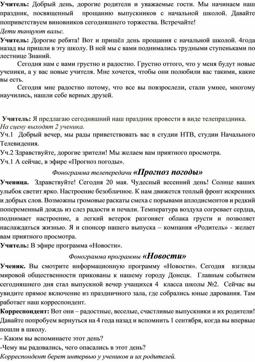 Ученик. Вы смотрите информационную программу «Новости». Сегодня взгляды мировой общественности прикованы к нашему городу Донецк. Главным событием сегодняшнего дня стал выпускной вечер учащихся 4 класса школы №2. Сейчас вы увидите прямое включение из праздничного зала, где собрались юные дарования. Там работает наш корреспондент.