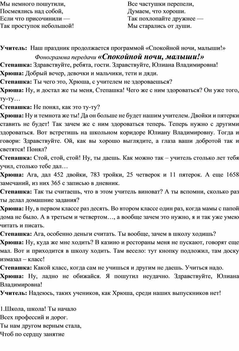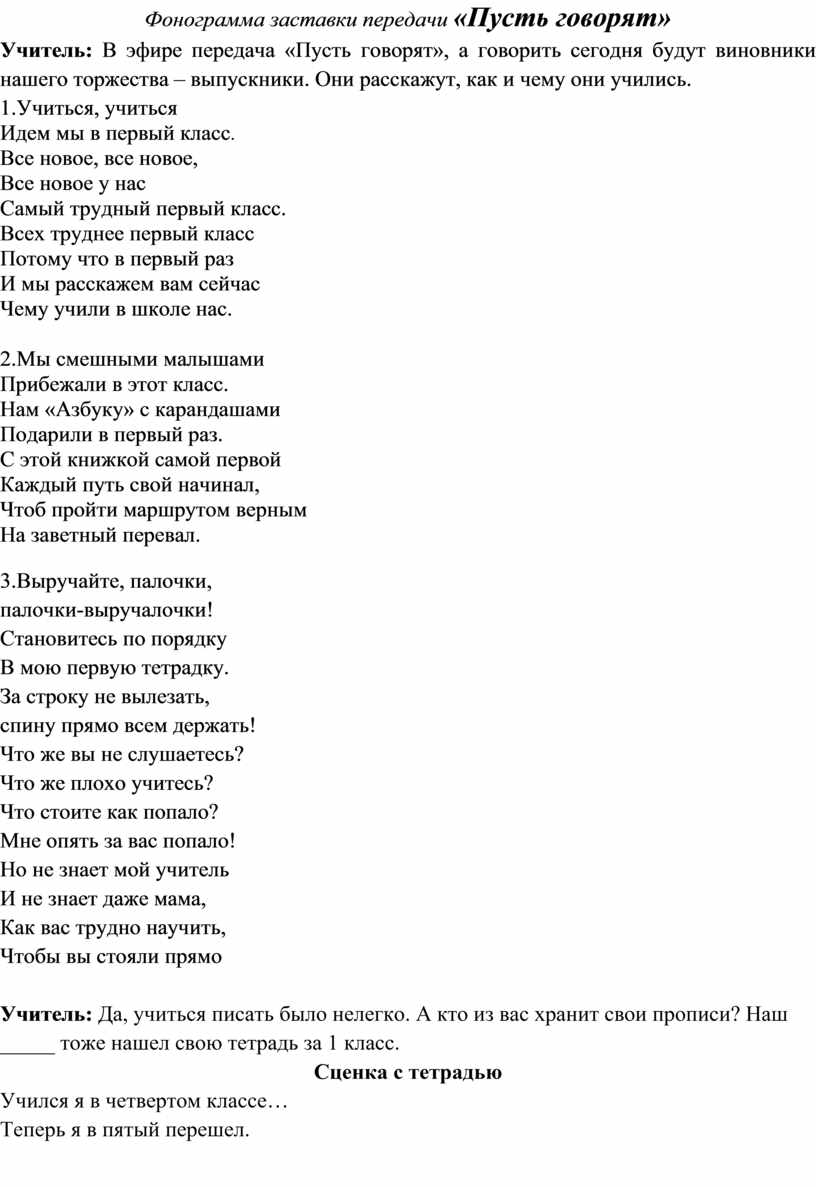 Учитель: В эфире передача «Пусть говорят», а говорить сегодня будут виновники нашего торжества – выпускники. Они расскажут, как и чему они учились.