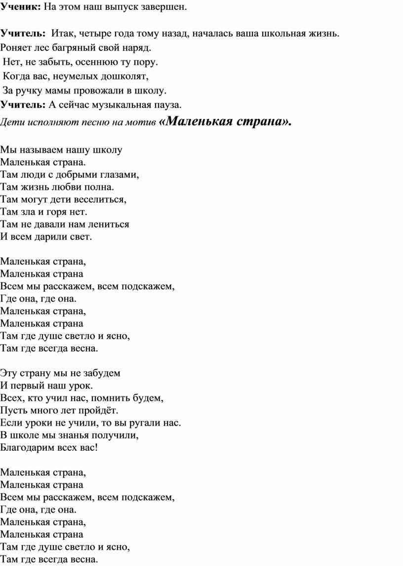 Учитель: Дорогие ребята! Вот и пришёл день прощания с начальной школой. 4года назад вы пришли в эту школу. В ней мы с вами поднимались трудными ступеньками по лестнице Знаний.