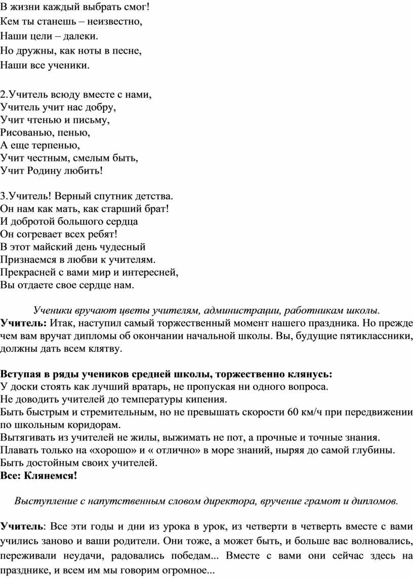 Учитель: Итак, наступил самый торжественный момент нашего праздника. Но прежде чем вам вручат дипломы об окончании начальной школы. Вы, будущие пятиклассники, должны дать всем клятву.