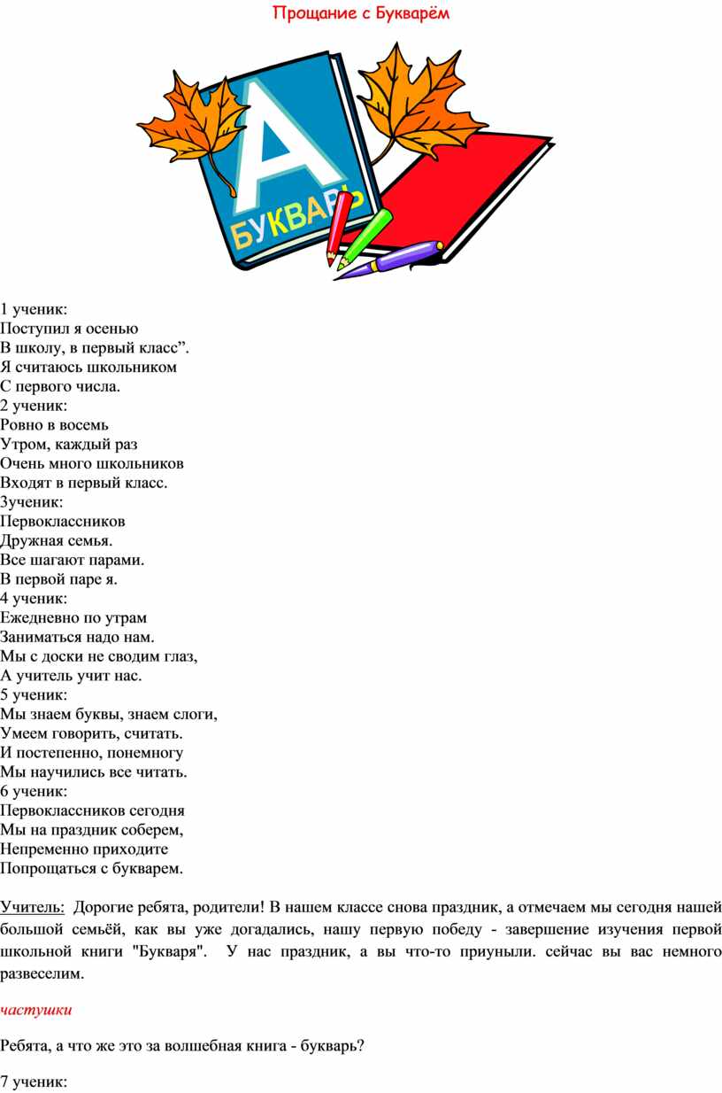 Учитель: Дорогие ребята, родители! В нашем классе снова праздник, а отмечаем мы сегодня нашей большой семьёй, как вы уже догадались, нашу первую победу - завершение изучения первой школьной книги "Букваря". У нас праздник, а вы что-то приуныли. сейчас вы вас немного развеселим.