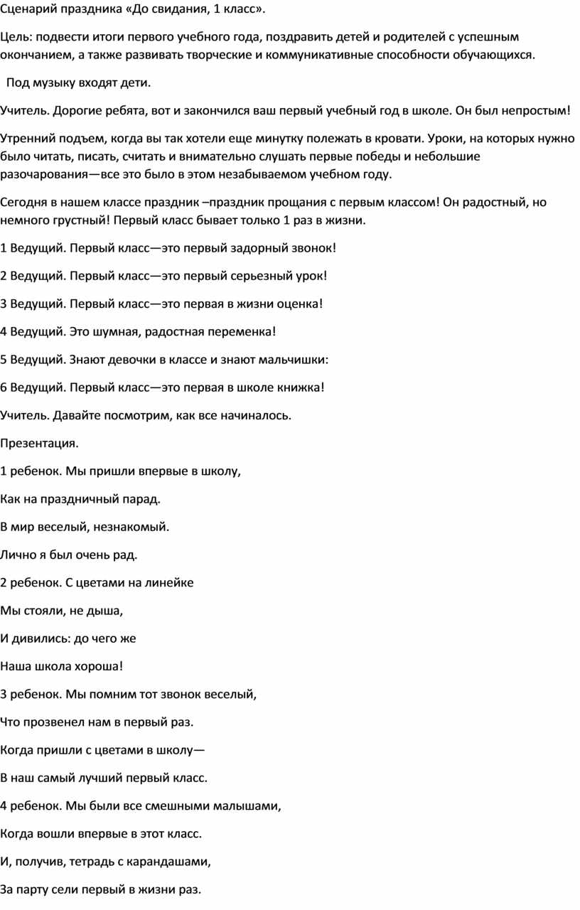 Учитель. Дорогие ребята, вот и закончился ваш первый учебный год в школе. Он был непростым!