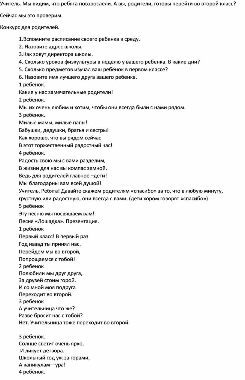 Учитель. Мы видим, что ребята повзрослели. А вы, родители, готовы перейти во второй класс?