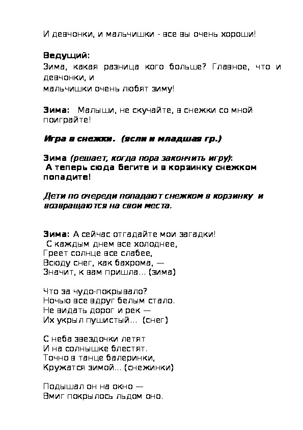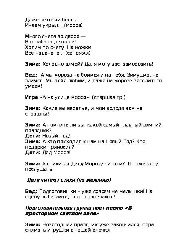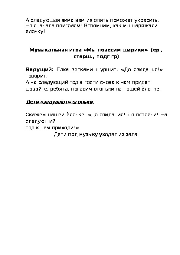 Ведущий: Вот и пролетели новогодние праздники и зимние каникулы, пришла пора отпускать нашу зеленую гостью - елочку в лес. Давайте сегодня еще раз поиграем возле елки и станцуем праздничные хороводы, чтобы новогодняя красавица вернулась в детский сад в следующем году! Согласны?