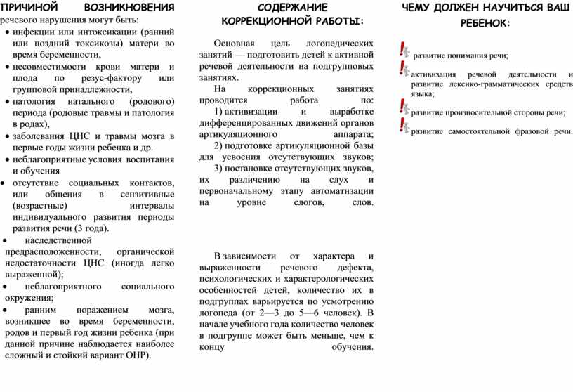 · ранним поражением мозга, возникшее во время беременности, родов и первый год жизни ребенка (при данной причине наблюдается наиболее сложный и стойкий вариант ОНР).