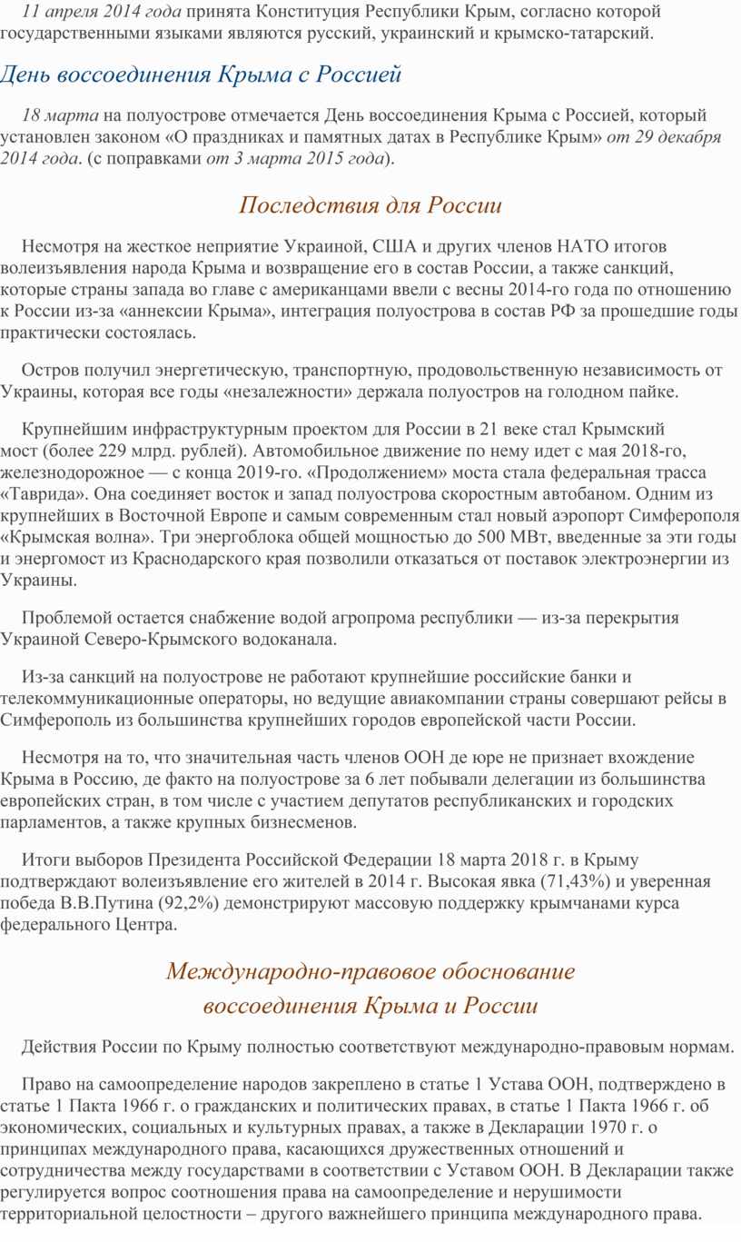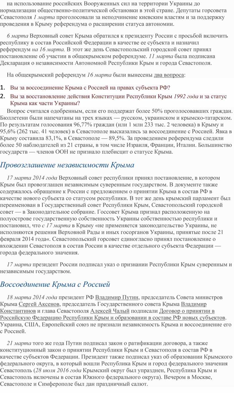 18 марта 2014 года президент РФ Владимир Путин, председатель Совета министров Крыма Сергей Аксенов, председатель Государственного совета Крыма Владимир Константинов и глава Севастополя Алексей Чалый подписали Договор о принятии в Российскую Федерацию Республики Крым и образовании в составе РФ новых субъектов. Украина, США, Европейский союз не признали независимость Крыма и воссоединение его с Россией.