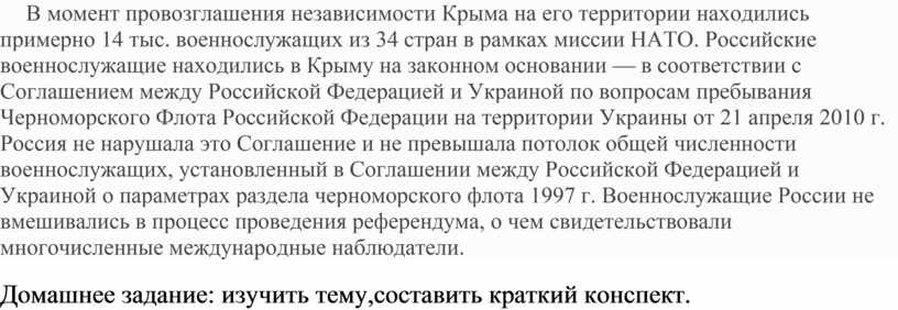 В момент провозглашения независимости Крыма на его территории находились примерно 14 тыс. военнослужащих из 34 стран в рамках миссии НАТО. Российские военнослужащие находились в Крыму на законном основании — в соответствии c Соглашением между Российской Федерацией и Украиной по вопросам пребывания Черноморского Флота Российской Федерации на территории Украины от 21 апреля 2010 г. Россия не нарушала это Соглашение и не превышала потолок общей численности военнослужащих, установленный в Соглашении между Российской Федерацией и Украиной о параметрах раздела черноморского флота 1997 г. Военнослужащие России не вмешивались в процесс проведения референдума, о чем свидетельствовали многочисленные международные наблюдатели.