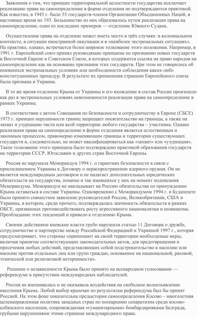 Россия не нарушала Меморандум 1994 г. о гарантиях безопасности в связи с присоединением Украины к Договору о нераспространении ядерного оружия. Он не является международным договором и не налагает дополнительных юридических обязательств на государства, помимо и так имевшихся у них на момент подписания Меморандума. Меморандум не накладывает на Россию обязательства по принуждению Крыма оставаться в составе Украины. Одновременно с Меморандумом 1994 г. в Будапеште было принято совместное заявление руководителей России, Великобритании, США и Украины, в котором, среди прочего, подтверждалась значимость обязательств в рамках ОБСЕ, призванных противодействовать росту агрессивного национализма и шовинизма. Преобладание этих тенденций и привело к отделению Крыма.