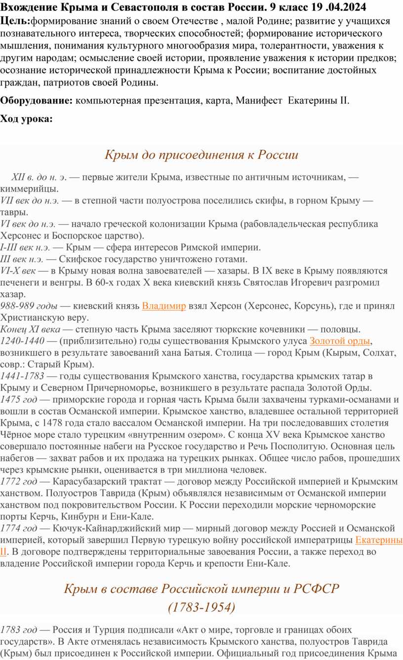 Оборудование: компьютерная презентация, карта, Манифест Екатерины II.