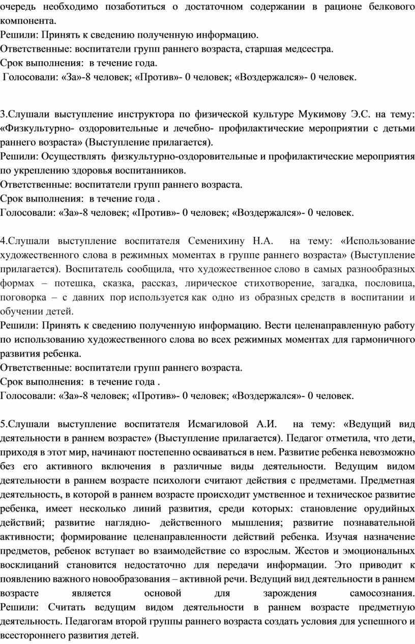 2. Слушали выступление старшей медсестры Чижовой Е.Б. на тему: «Организация питания детей раннего возраста» (Выступление прилагается). Чижова Е.Б. отметила, что полноценное развитие детей невозможно без организации сбалансированного питания с соблюдением установленных норм питания. При организации питания детей в первую очередь необходимо позаботиться о достаточном содержании в рационе белкового компонента.