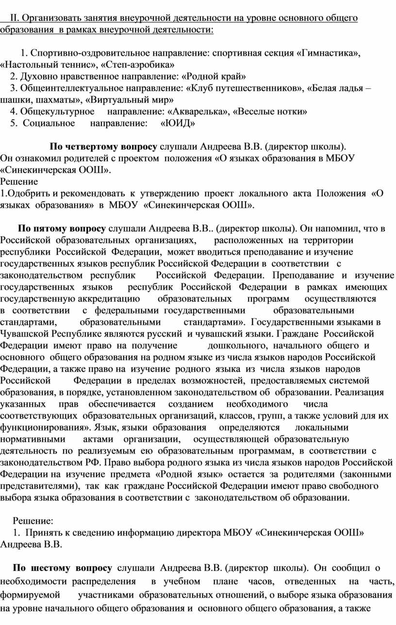 По пятому вопросу слушали Андреева В.В.. (директор школы). Он напомнил, что в Российской образовательных организациях, расположенных на территории республики Российской Федерации, может вводиться преподавание и изучение государственных языков республик Российской Федерации в соответствии с законодательством республик Российской Федерации. Преподавание и изучение