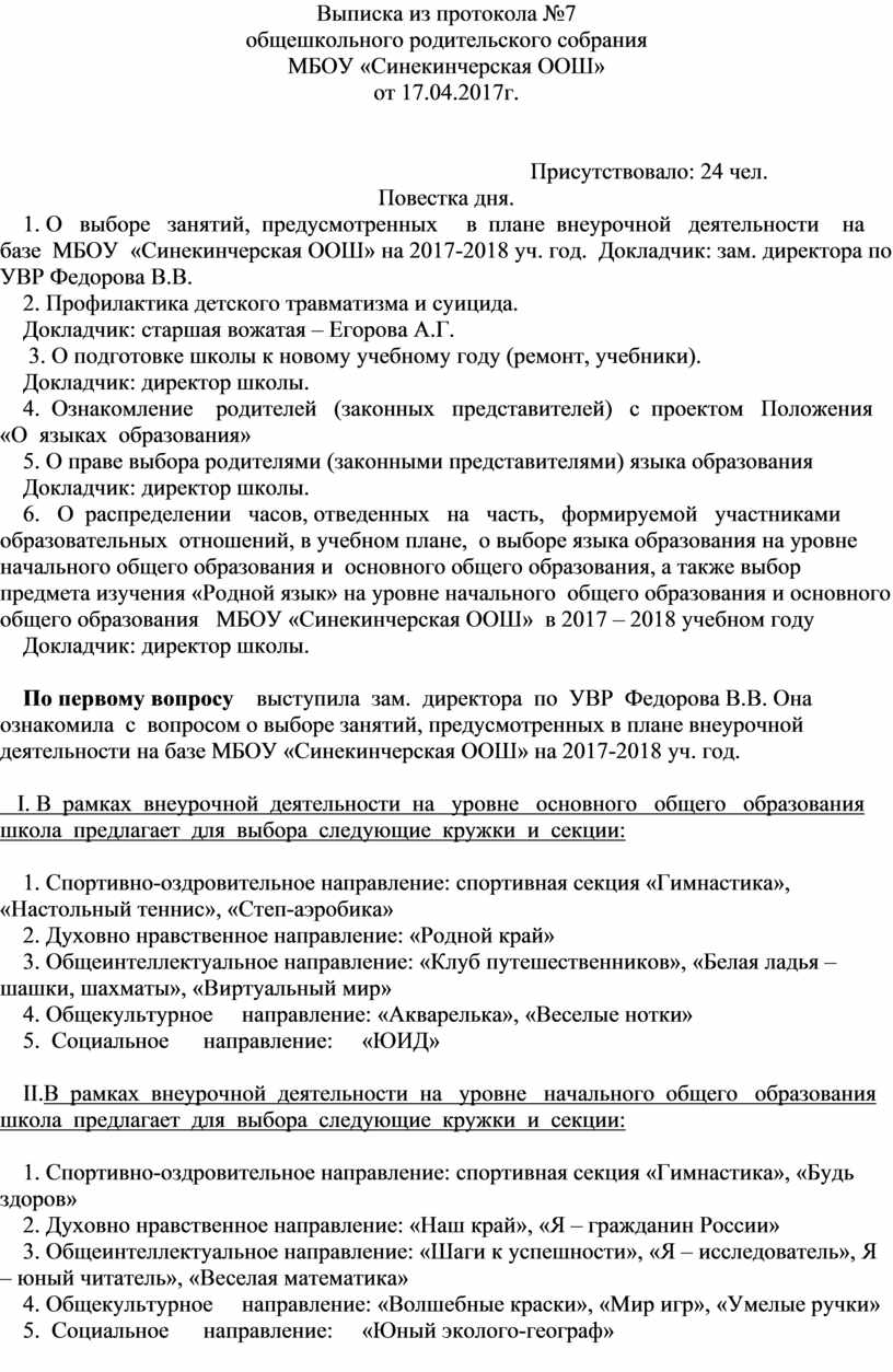 1. Подведение итогов выполнения решения родительского собрания №7 от 17 апреля 2017 года вопроса № 5 «О выборе языка обучения на уровне начального общего образования и основного общего образования, а также выбор предмета изучения «Родной язык» на уровне начального общего образования и основного общего образования МБОУ «Синекинчерская ООШ» в 2017 – 2018 учебном году»