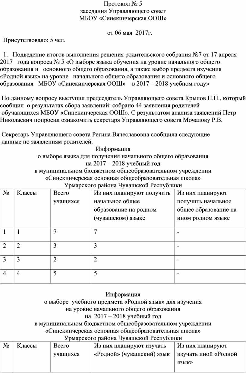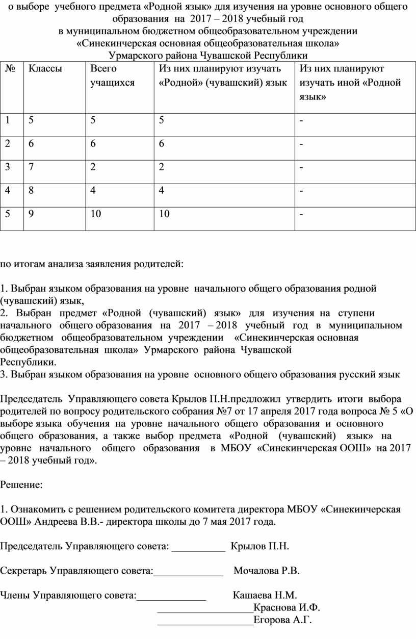 Председатель Управляющего совета Крылов П.Н.предложил утвердить итоги выбора родителей по вопросу родительского собрания №7 от 17 апреля 2017 года вопроса № 5 «О выборе языка обучения на уровне начального общего образования и основного общего образования, а также выбор предмета «Родной (чувашский) язык» на уровне начального общего образования в МБОУ «Синекинчерская ООШ» на 2017 – 2018 учебный год».