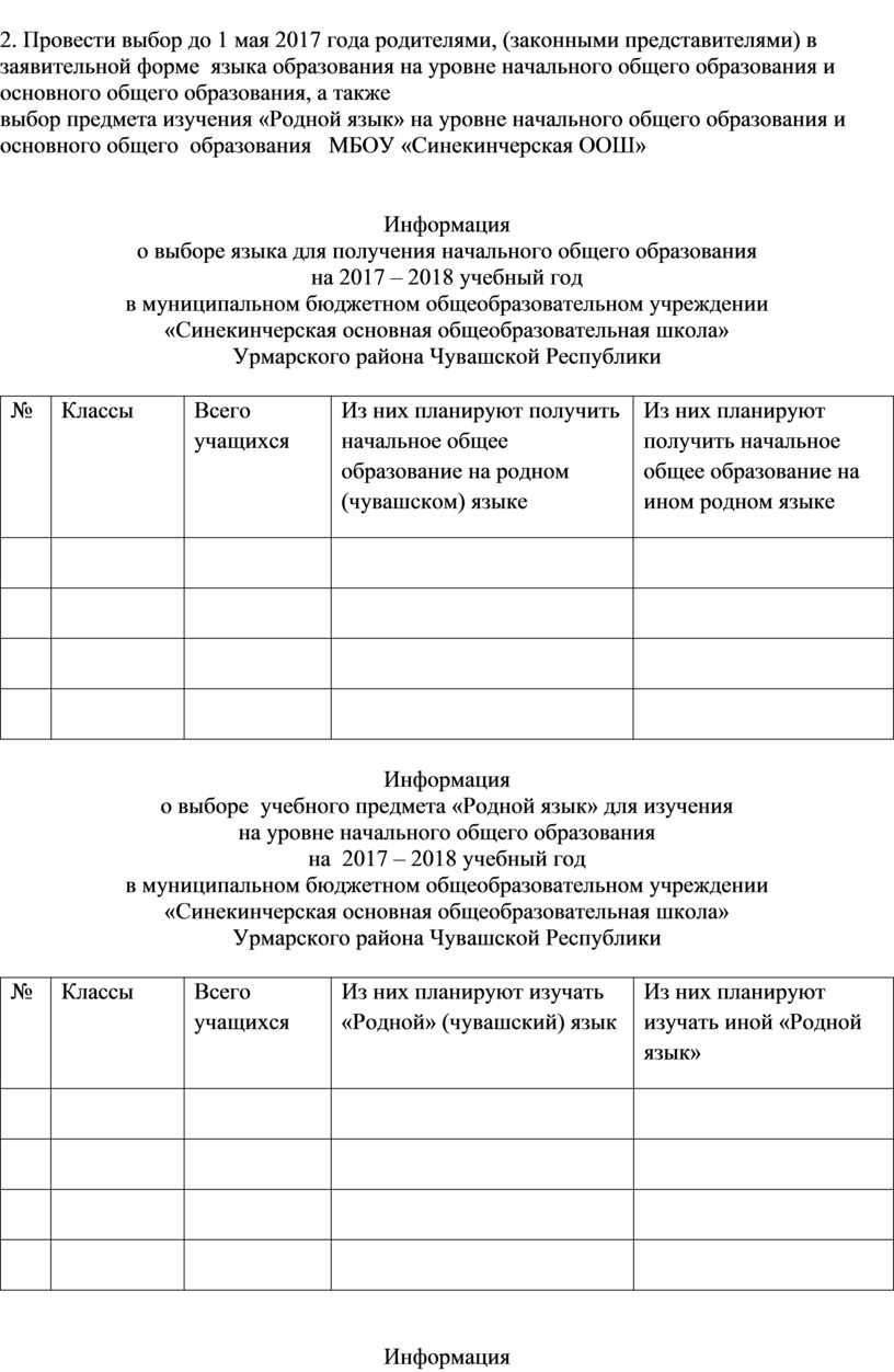2. Провести выбор до 1 мая 2017 года родителями, (законными представителями) в заявительной форме языка образования на уровне начального общего образования и основного общего образования, а также