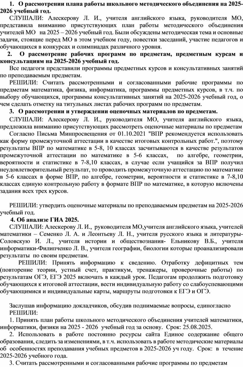 1. Принять план работы школьного методического объединения учителей математики, информатики, физики на 2025 - 2026 учебный год за основу. Срок: 25.08.2025.