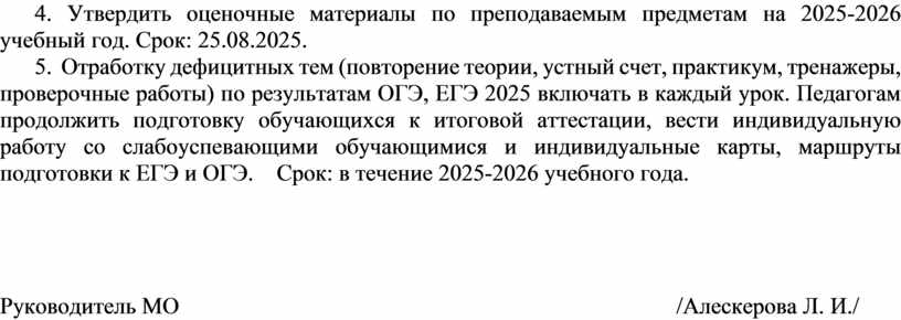 4. Утвердить оценочные материалы по преподаваемым предметам на 2025-2026 учебный год. Срок: 25.08.2025.