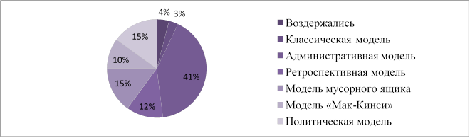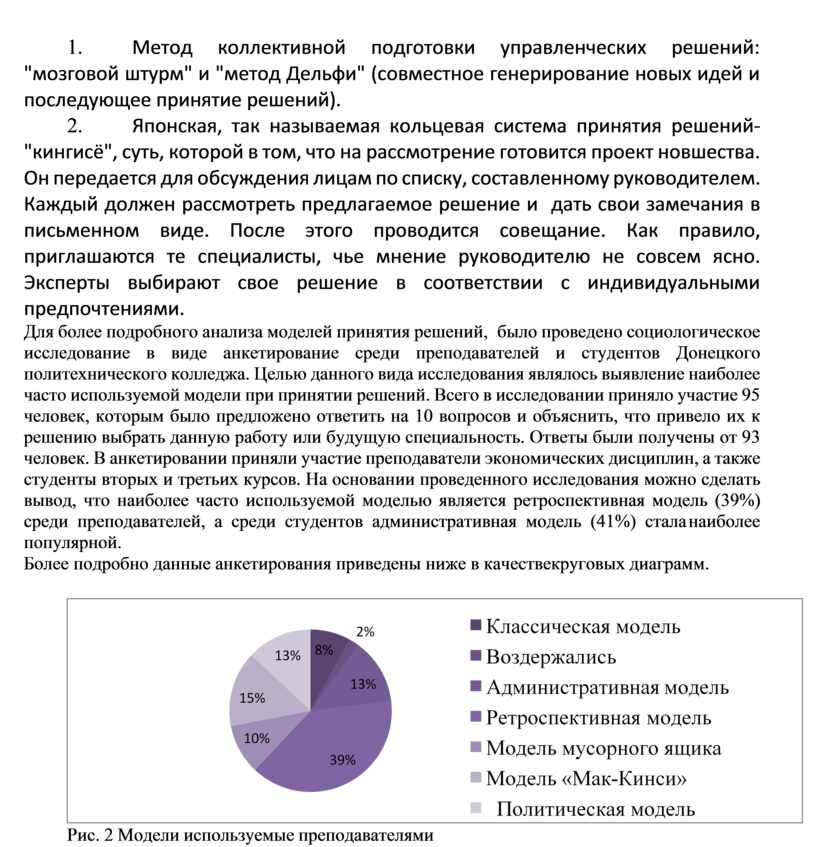 Для более подробного анализа моделей принятия решений, было проведено социологическое исследование в виде анкетирование среди преподавателей и студентов Донецкого политехнического колледжа. Целью данного вида исследования являлось выявление наиболее часто используемой модели при принятии решений. Всего в исследовании приняло участие 95 человек, которым было предложено ответить на 10 вопросов и объяснить, что привело их к решению выбрать данную работу или будущую специальность. Ответы были получены от 93 человек. В анкетировании приняли участие преподаватели экономических дисциплин, а также студенты вторых и третьих курсов. На основании проведенного исследования можно сделать вывод, что наиболее часто используемой моделью является ретроспективная модель (39%) среди преподавателей, а среди студентов административная модель (41%) стала наиболее популярной.