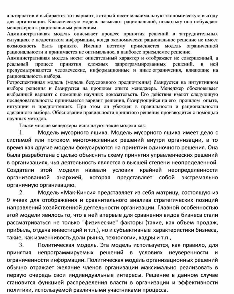 Процесс принятия решений сложен и многогранен. Он может быть классическим (рациональная модель), административным (модель ограниченной рациональности) и ретроспективным. Выбор менеджером той или иной модели зависит от его персональных предпочтений, а также степени определенности и риска.