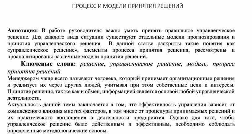 Ключевые слова: решение, управленческое решение, модель, процесс принятия решений.