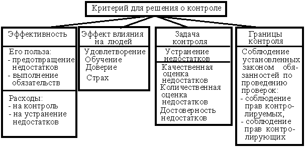 Для принятия решения о контроле и организации процессов контроля могут иметь значение ряд критериев: его эффективность, эффект влияния на людей, задачи контроля и его границы (рис. 40).