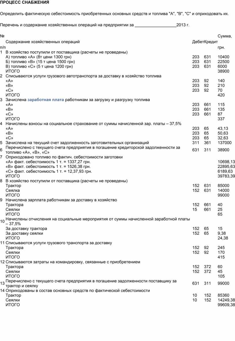 Определить фактическую себестоимость приобретенных основных средств и топлива "А", "В", "С" и оприходовать их.